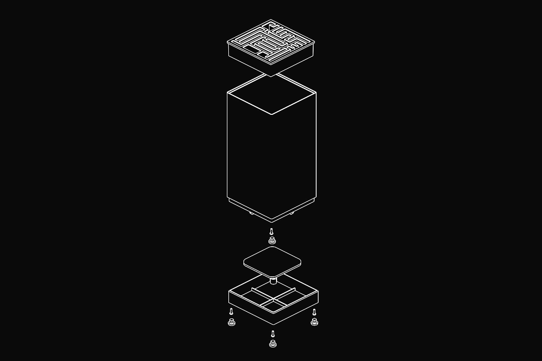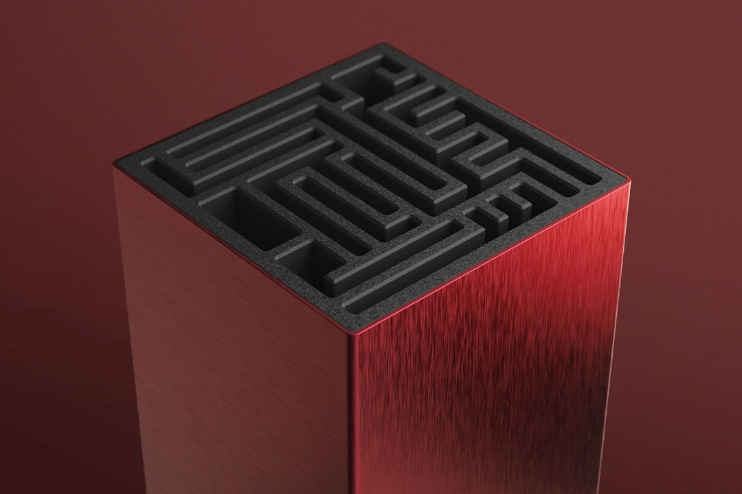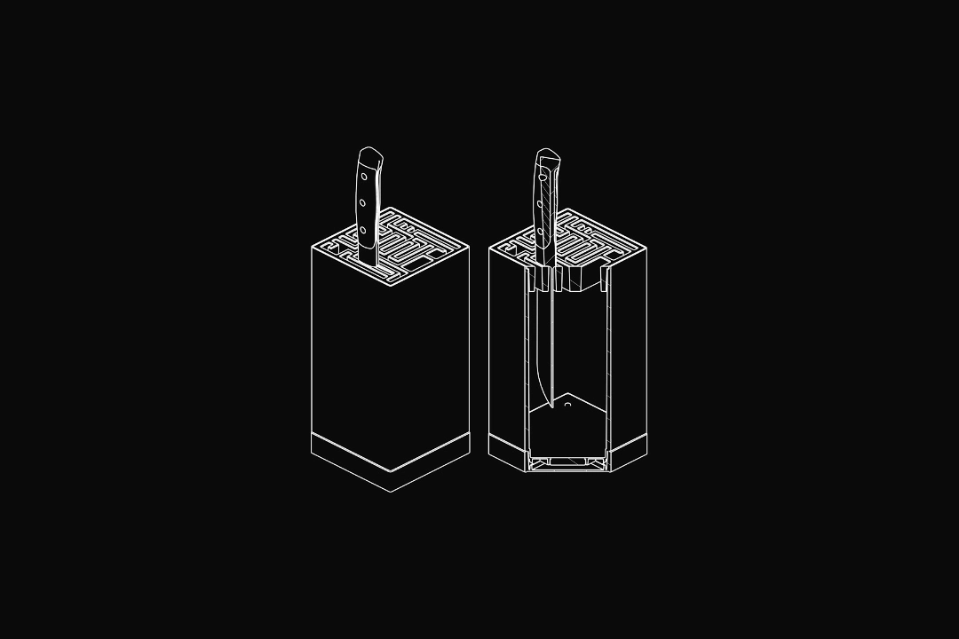 The maze inspired storage slots emerged as a natural solution to storing multiple knife sizes on a very compact footprint. All knives are stored free-hanging for better aeration and improved hygiene without trapped moisture. The patented construction is easily disassembled if the inside needs cleaning.