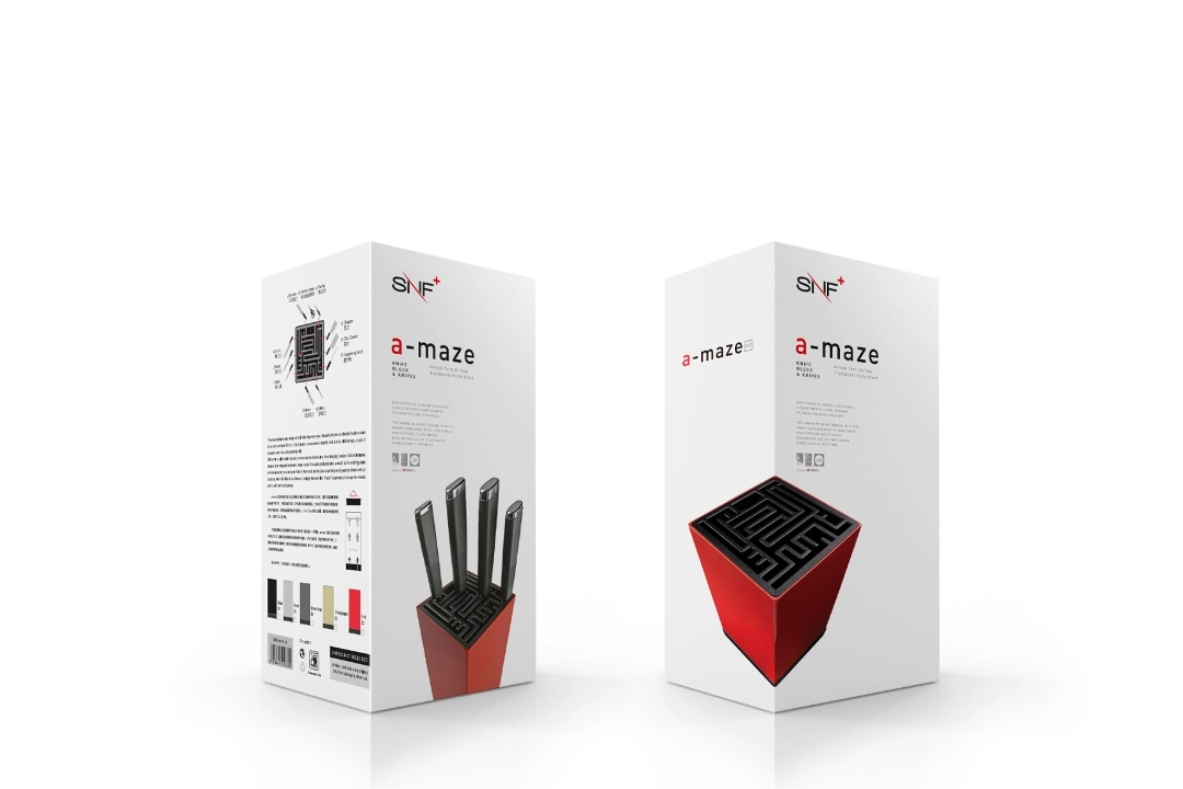 The a-maze knife block design stimulates our mental and visual senses. It playfully merges together aesthetics and functionality to fulfill its purpose. Emotionally it speaks to us through our childhood memories and entertains our curiosity with a joyful sense of achievement.